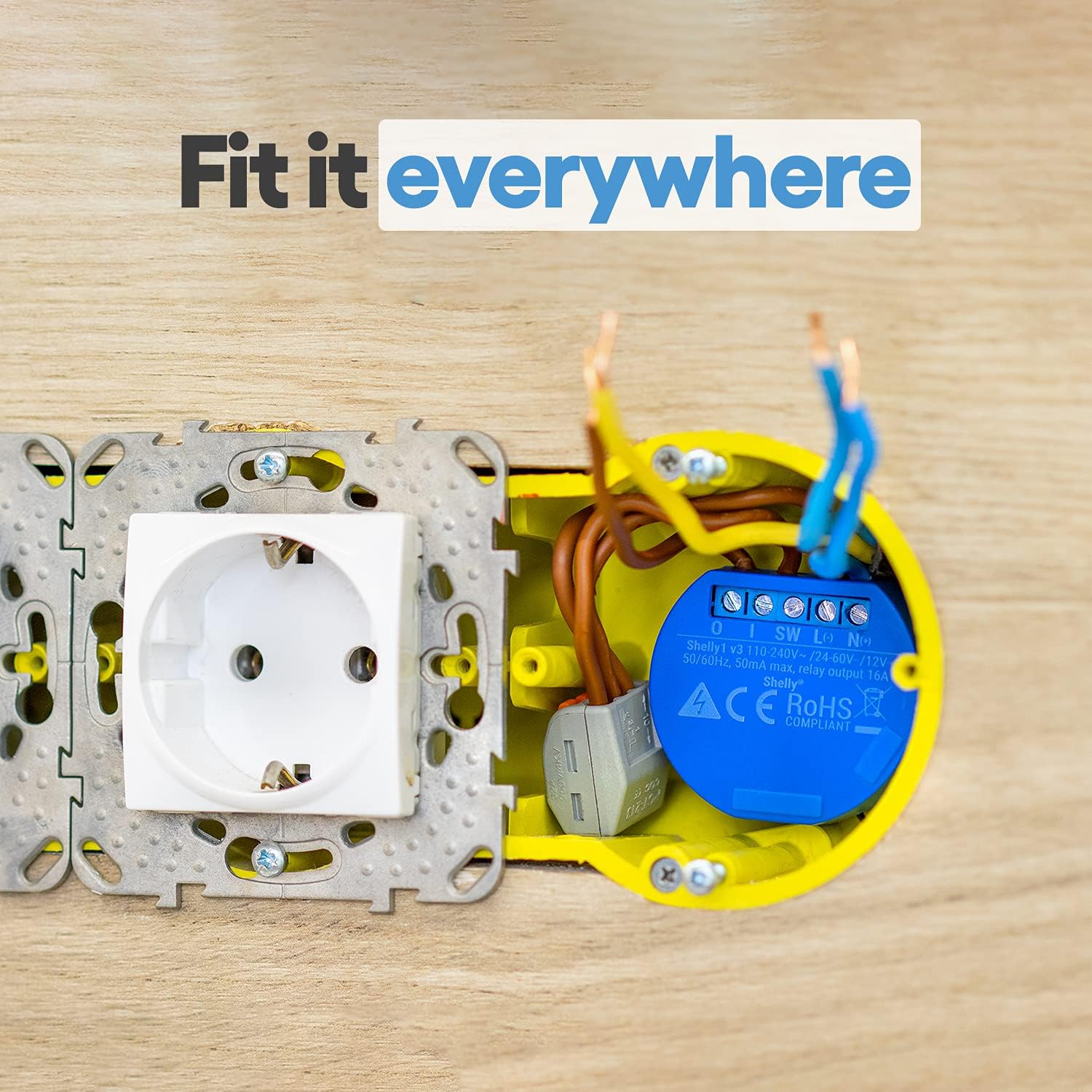 - Installation : Construisez Shelly 1 en une console encastrée standard derrière des prises et des interrupteurs d’éclairage pour contrôler l’alimentation via elle.